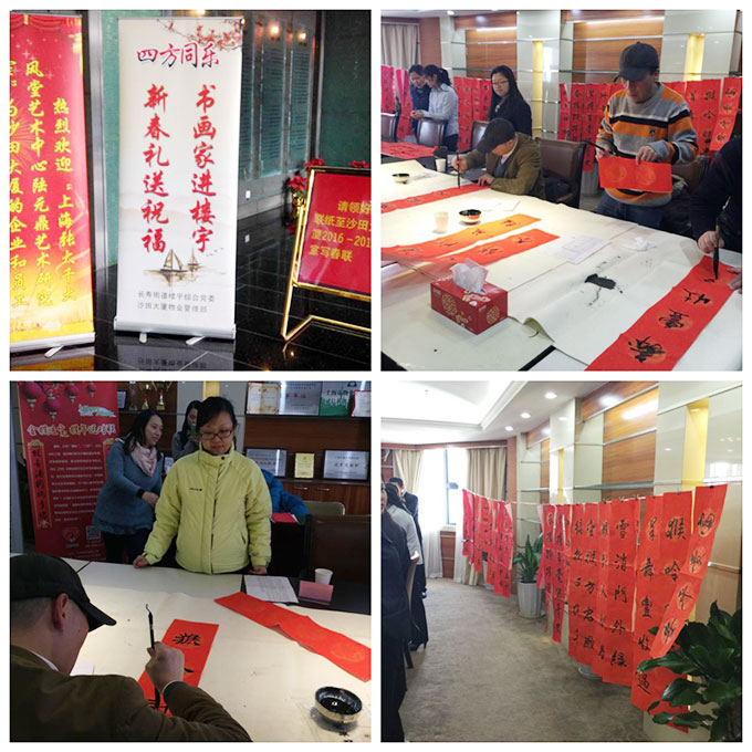 貼春聯(lián)是中華名族一直延續(xù)的老傳統(tǒng),象征吉祥。2016年2月1日,長(zhǎng)壽路街道黨工委、長(zhǎng)壽路街道社區(qū)黨委的組織下,長(zhǎng)壽幸福港攜手上海張大千大風(fēng)堂藝術(shù)中心的書法家們來(lái)到沙田大廈,為沙田大廈企業(yè)和白領(lǐng)們寫春聯(lián)送祝福。