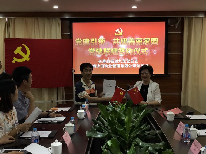 2018年6月28日,由市物業(yè)協(xié)會黨建工作指導委員會普陀分會和沙田物業(yè)聯(lián)合舉辦的“黨建引領(lǐng)共建美麗家園,迎七一黨建聯(lián)建工作推進會暨共建協(xié)議簽約儀式”在沙田物業(yè)公司總部舉行。長壽路街道黨建辦、長壽路街道九茂黨總支、長壽路街道芙蓉花苑黨支部、長壽路街道上青佳園黨支部、曹楊新村街道沙溪園黨總支出席本次會議,沙田物業(yè)黨支部、公司職能部門參會。