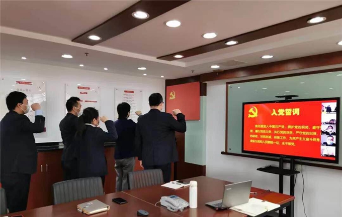 2020年3月26日,沙田物業(yè)黨支部在黨建活動室開展“將初心落在行動上、把使命擔(dān)在肩膀上”主題黨日活動,7名黨員、1名預(yù)備黨員和2名積極分子,共10人參加此次主題黨日活動,其中6人在會議室,4人通過網(wǎng)絡(luò)視頻連線參會。黨支部書記趙小鳳同志帶領(lǐng)大家重溫入黨誓言,3位黨員同志也通過視頻在各自的工作崗位上再次宣誓。在此防疫工作仍十分關(guān)鍵的時刻,各位黨員同志在重溫入黨誓言后,在經(jīng)歷了一個多月的防疫工作疲憊的身心,又重新煥發(fā)出高昂的斗志。